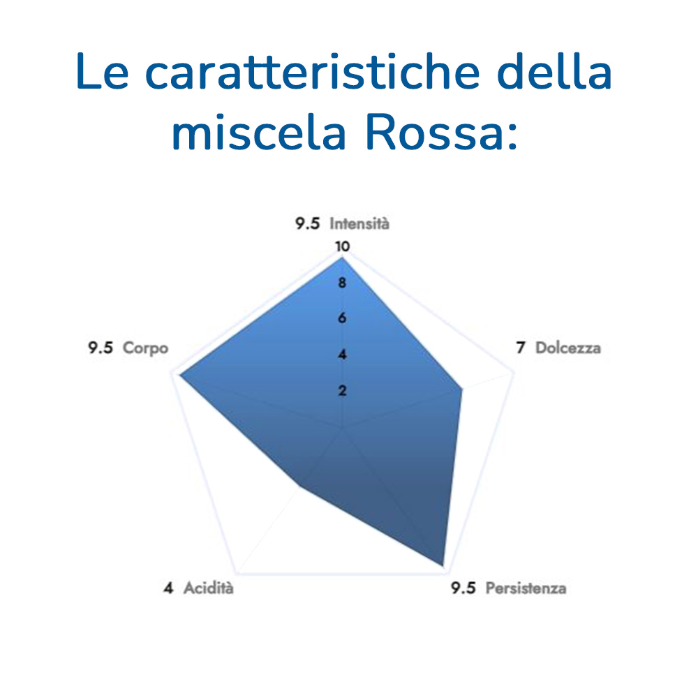 MISCELA ROSSA: Pura energia nel gusto, forte e cremosa ed allo stesso tempo deliziosa. Presenta un carattere deciso e persistente che infonde una profonda sensazione di piacere al palato, per una magica sensazione.100% robusta selezionata.
